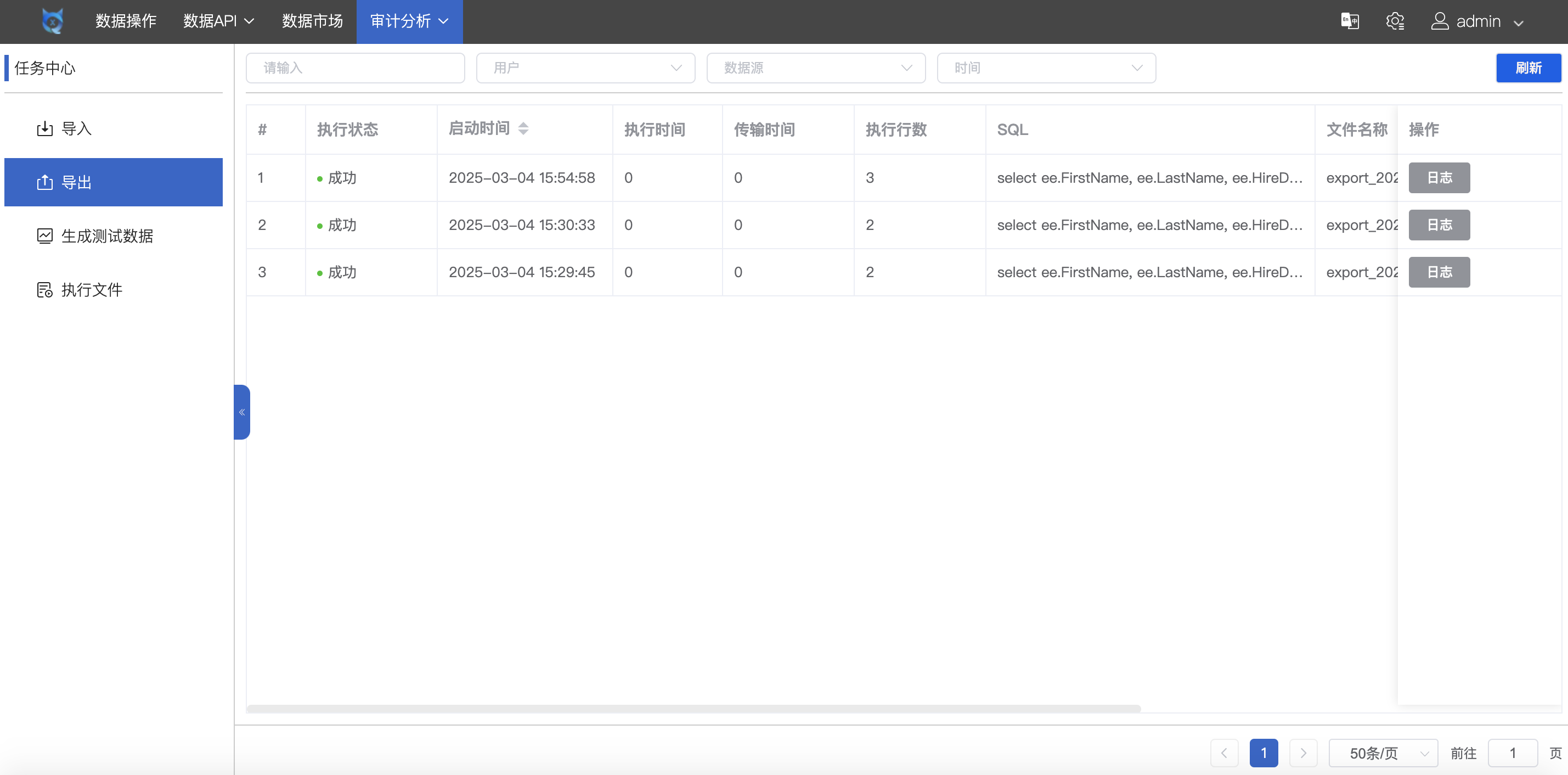 位于顶部主菜单的 “任务中心” 选项卡,记录了用户对数据库进行的数据导入、数据导出、自动生成测试数据、执行 SQL 文件的行为日志。